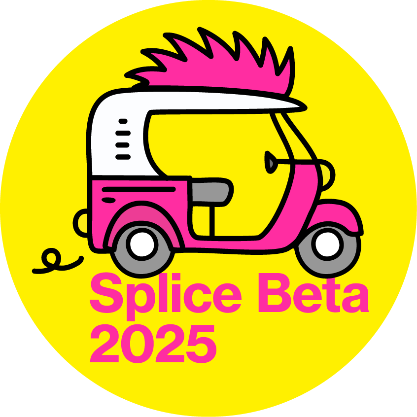Illustration of a pink tuk-tuk with a yellow background, pink spiky hair on top, and text that reads "Splice Beta 2025."
